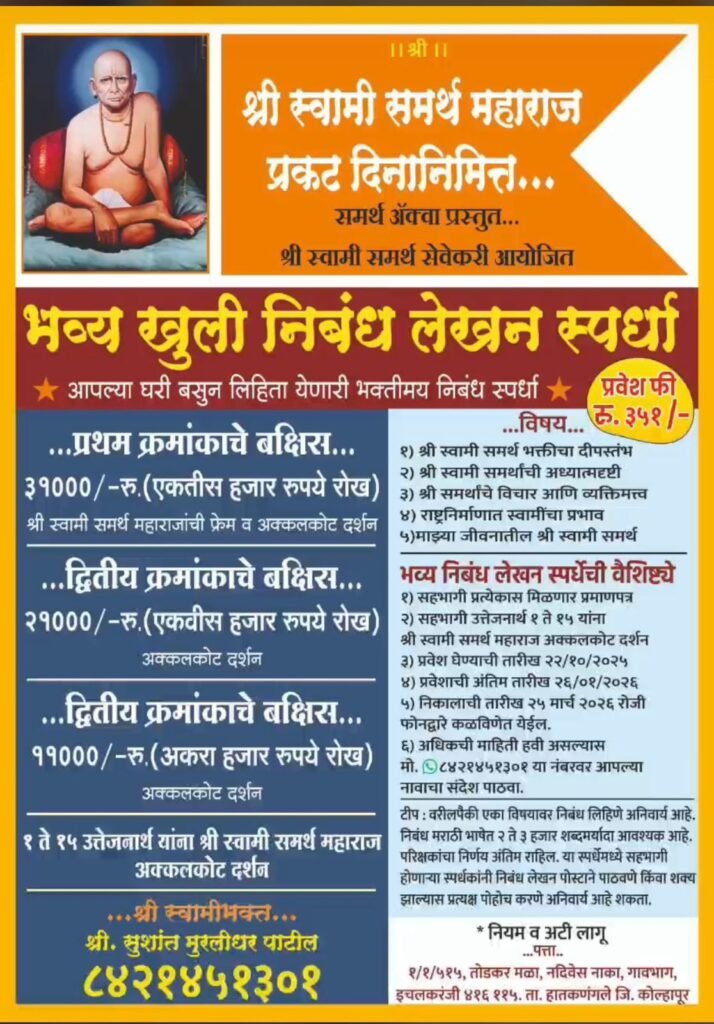 рдЗрдЪрд▓рдХрд░рдВрдЬреА рд╢реНрд░реА рд╕реНрд╡рд╛рдореА рд╕рдорд░реНрде рдорд╣рд╛рд░рд╛рдЬ рдкреНрд░рдХрдЯ рджрд┐рдирд╛рдирд┐рдорд┐рддреНрдд рд╕рдорд░реНрде рдЖрдВрд╡рд│рд╛ рдкреНрд░рд╕реНрддреБрдд рдЖрдгрд┐ рд╢реНрд░реА рд╕реНрд╡рд╛рдореА рд╕рдорд░реНрде рд╕реЗрд╡реЗрдХрд░реА рдпрд╛рдВрдЪреНрдпрд╛ рд╡рддреАрдиреЗ рднрд╡реНрдп рдЦреБрд▓реА рдирд┐рдмрдВрдз рд▓реЗрдЦрди рд╕реНрдкрд░реНрдзрд╛ рдЖрдпреЛрдЬрд┐рдд рдХрд░рдгреНрдпрд╛рдд рдЖрд▓реА рдЖрд╣реЗ. рд╣реА рд╕реНрдкрд░реНрдзрд╛ рднрдХреНрддрд┐рдордп рд╡рд╛рддрд╛рд╡рд░рдгрд╛рдд рдкрд╛рд░ рдкрдбрдгрд╛рд░ рдЕрд╕реВрди рд╕рд╣рднрд╛рдЧреА рдЖрдкрд▓реНрдпрд╛ рдШрд░рд╛рддреВрдирдЪ рдирд┐рдмрдВрдз рд▓рд┐рд╣реВрди рдкрд╛рдард╡реВ рд╢рдХрддрд╛рдд.